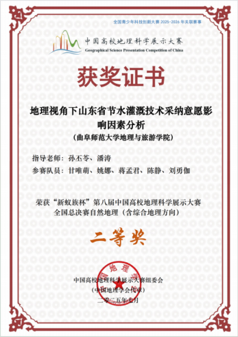 孙丕苓、潘涛老师指导,学生甘唯萌、姚娜、蒋孟君、陈静、刘勇伽完成的作品《地理视角下山东省节水灌溉技术采纳意愿影响因素分析》获得自然地理(含综合地理方向)组二等奖;孙丕苓老师指导,李珂、董一冉、冯宇佳、李冉、李纪琰完成的作品《基于生计分化视角的乡村农户生活用能模式及影响因素研究》获得人文地理组二等奖。李珂、李冉、冯宇佳三位同学作为参赛代表队伍接受央视频的采访,充分彰显了老虎机