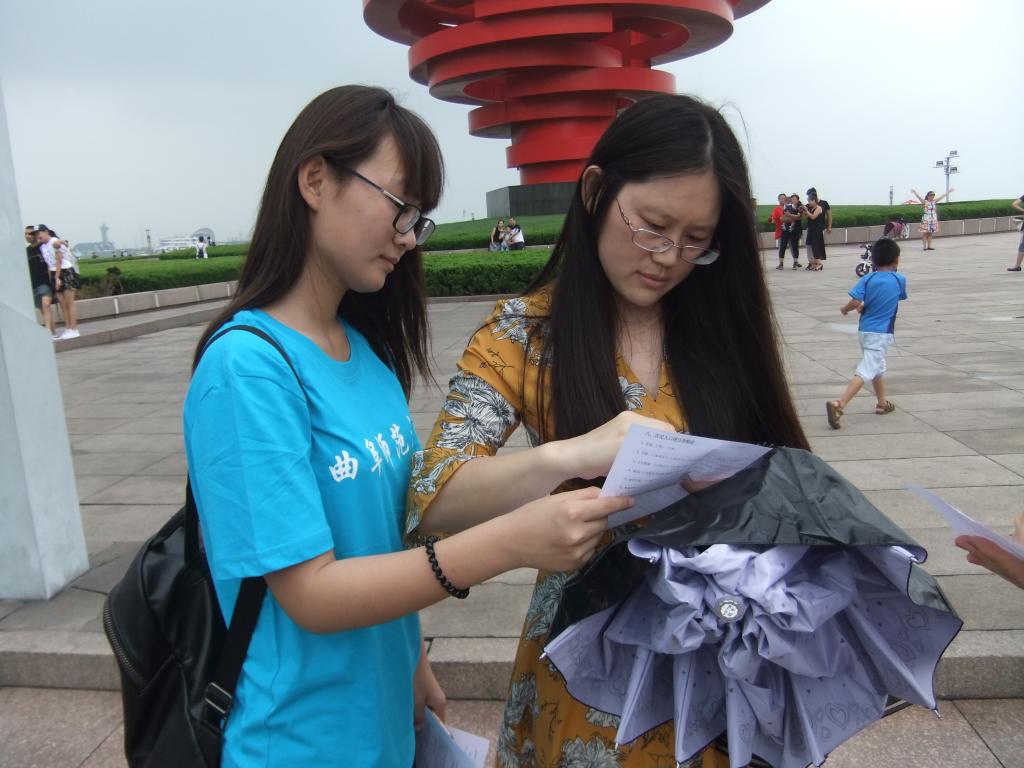 由于身着队服,路上行人很容易辨认出队员们的学生身份。但同时也存在着一个大的难题。由于五四广场大致以外地游客为主,而团队需要寻找本地居民,这使得队员们碰壁无数次,任务难度上升。最后,队员们暂时放弃寻找,开始讨论如何寻找那些符合团队目标的对象。经过讨论,队员们决定以休息区域和海边作为一个重点方向。果然,越来越多的人开始愿意配合团队进行调查。调查发现,当地居民对青岛本地的环保措施和环保政策都表示满意,个别居民表示一般。关于环保宣传方面,居民们都表示会为青岛积极宣传政府出台的环保措施,并坚持践行下去。