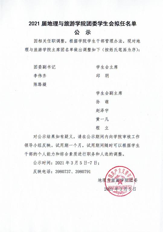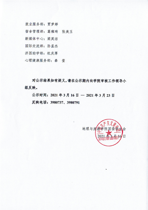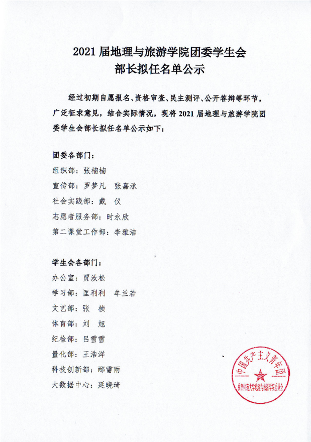 2021届老虎机 团委学生会副部长拟任名单公示