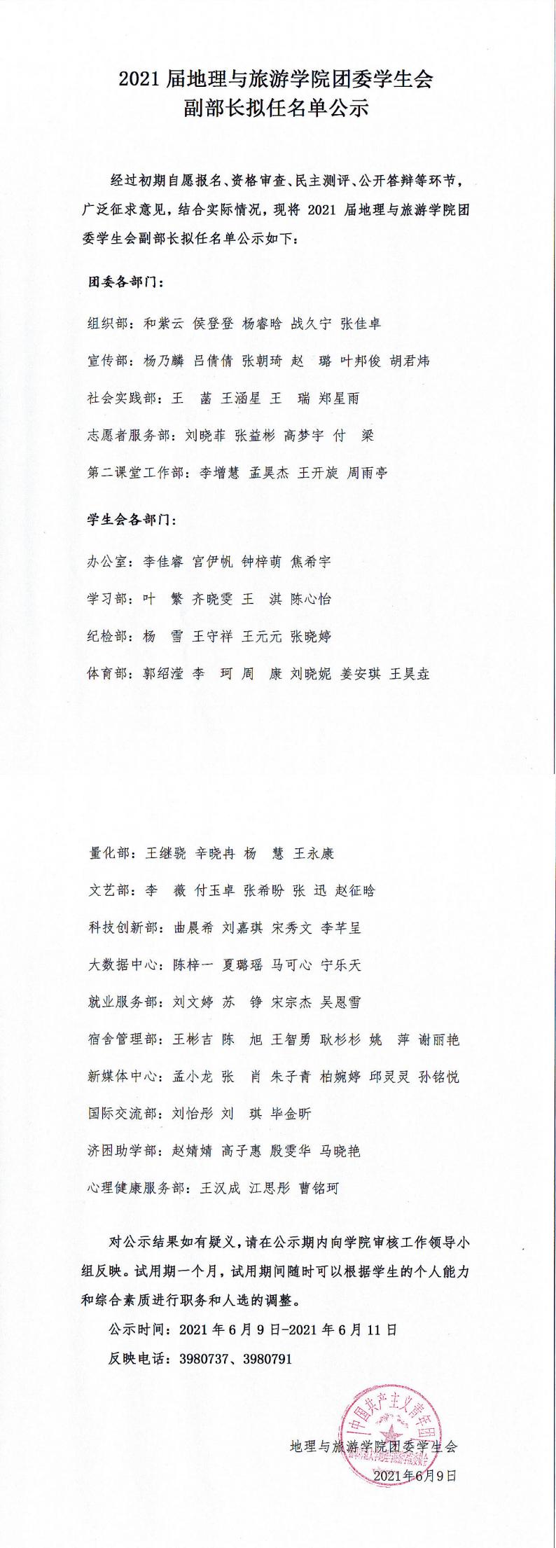 2021届老虎机 团委学生会副部长拟任名单公示