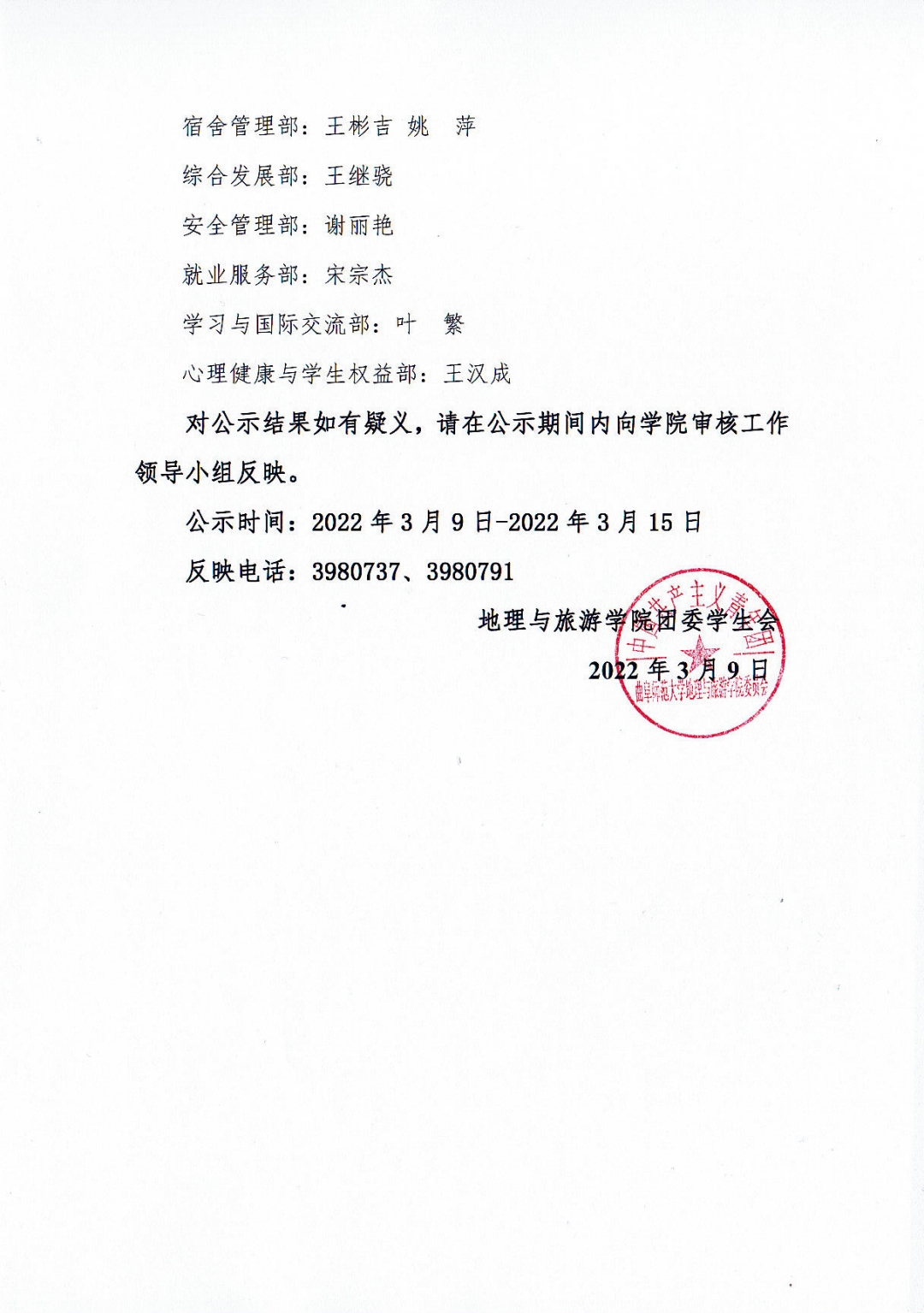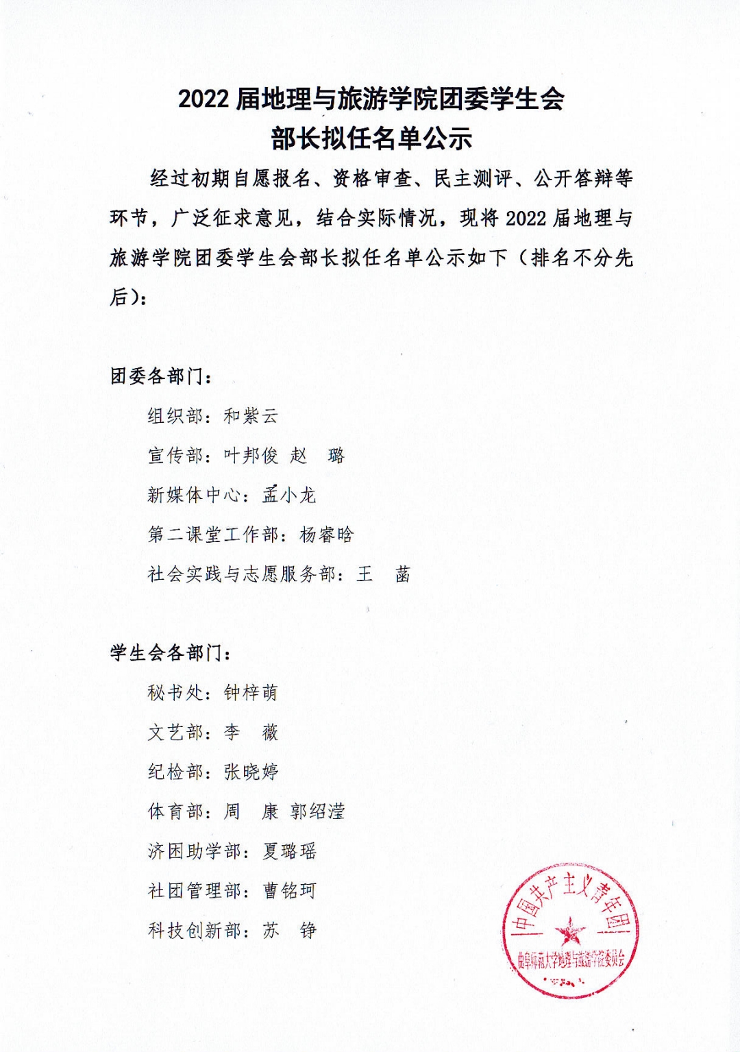 2022届老虎机 团委学生会部长拟任名单公示