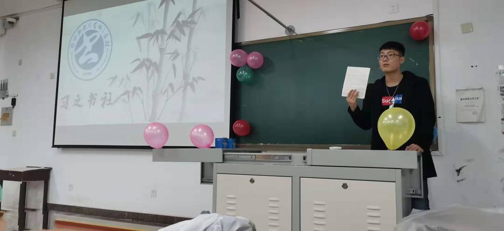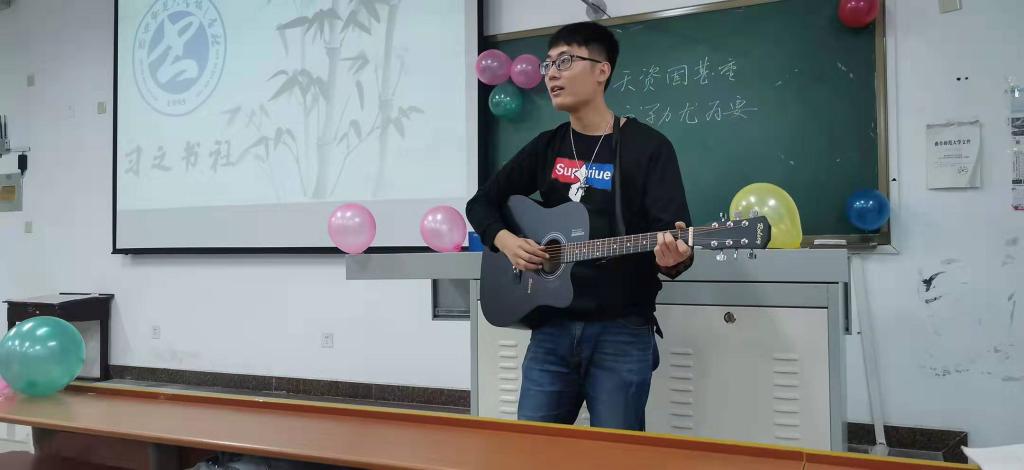 见面会伊始,习之书社各部部长通过展示PPT的形式介绍部门工作职能及人员设置。随后社团新成员逐一进行自我介绍。曲子乐为大家讲解书法方面的知识,向大家介绍自己的练字技巧并分享了自己与书法的故事。他精彩的讲述赢得台下阵阵掌声,现场气氛热烈。最后,曲子乐为大家带来精彩的吉他弹唱。至此,习之书社新生见面会顺利结束。