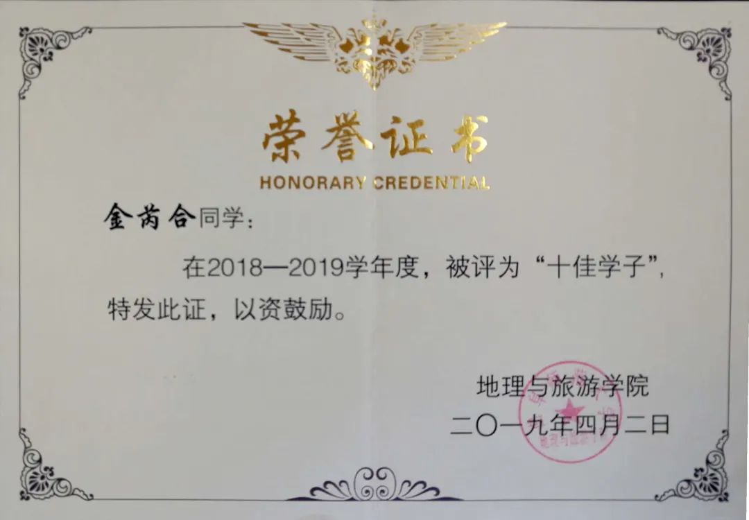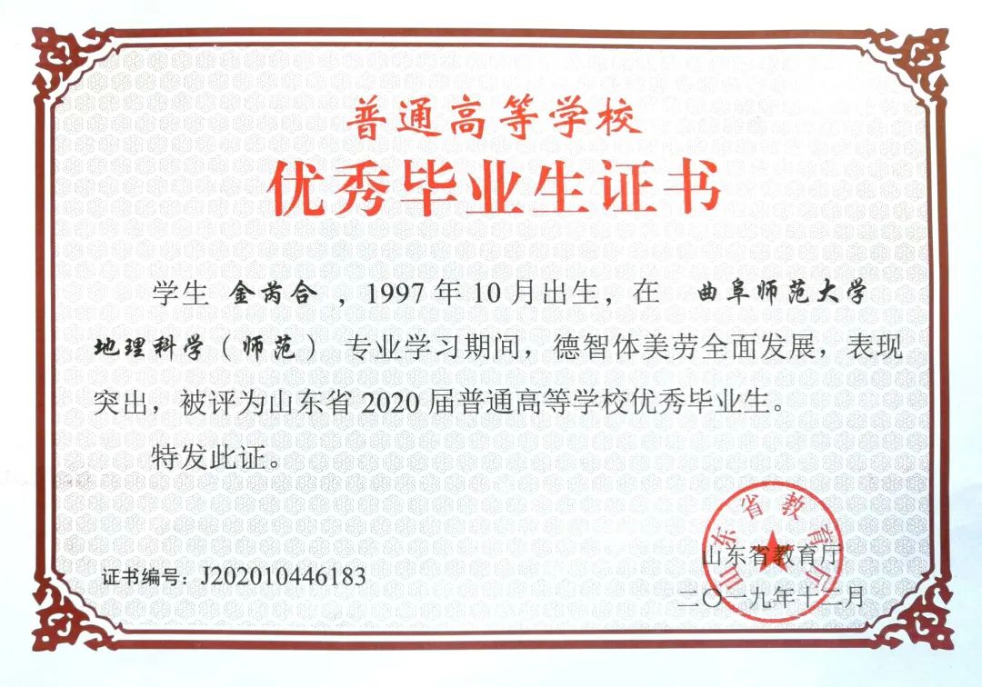 学习上,她认真钻研专业知识,刻苦学习,具备了较强的专业能力,前三年学习成绩在专业排名第1名,获得学校推免资格,目前已推免保送至世界双一流高校华东师范大学地理科学学院自然地理学专业攻读硕士研究生;在校期间曾多次获得“三好学生”(一等奖学金)、“三好学生标兵”等,还获得“国家奖学金”、“叶圣陶奖学金”、“校长奖学金”、“山东省优秀毕业生”、“十佳学子”等。课余认真学习英语与计算机知识,提升自身素质,成功考取了大学生四级、六级、“计算机二级MS Office高级应用”证书。