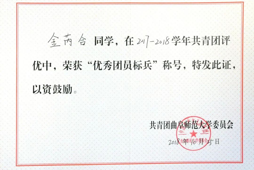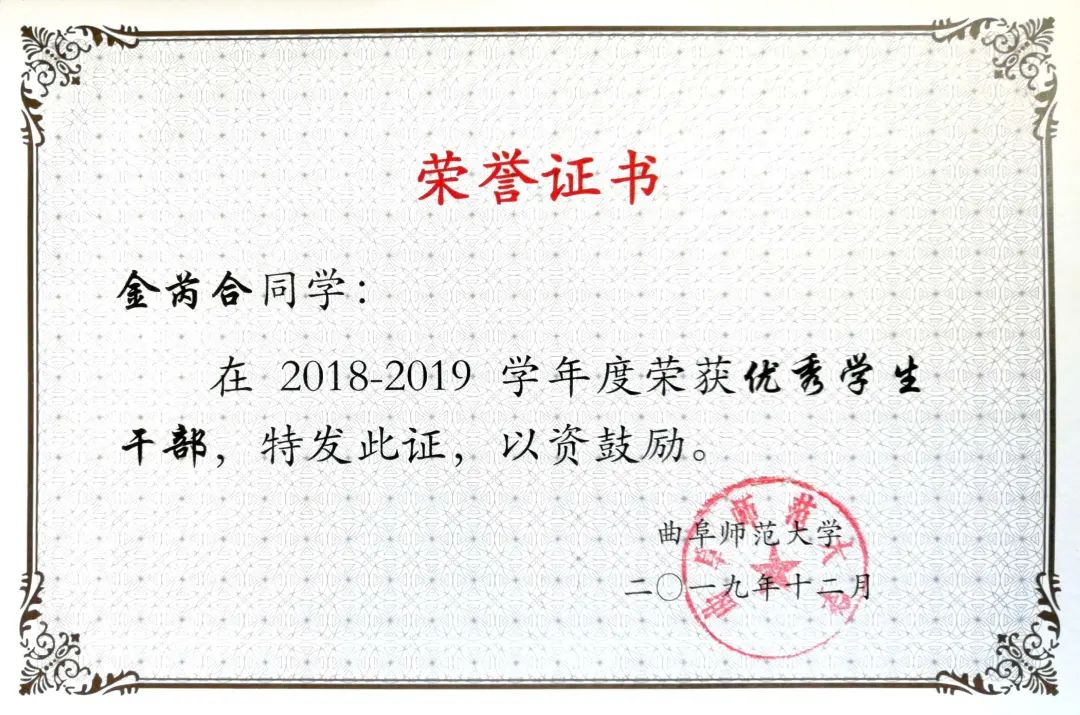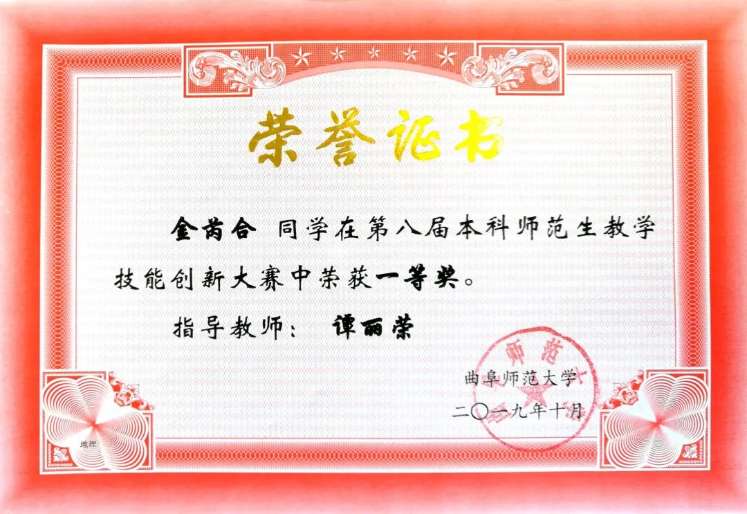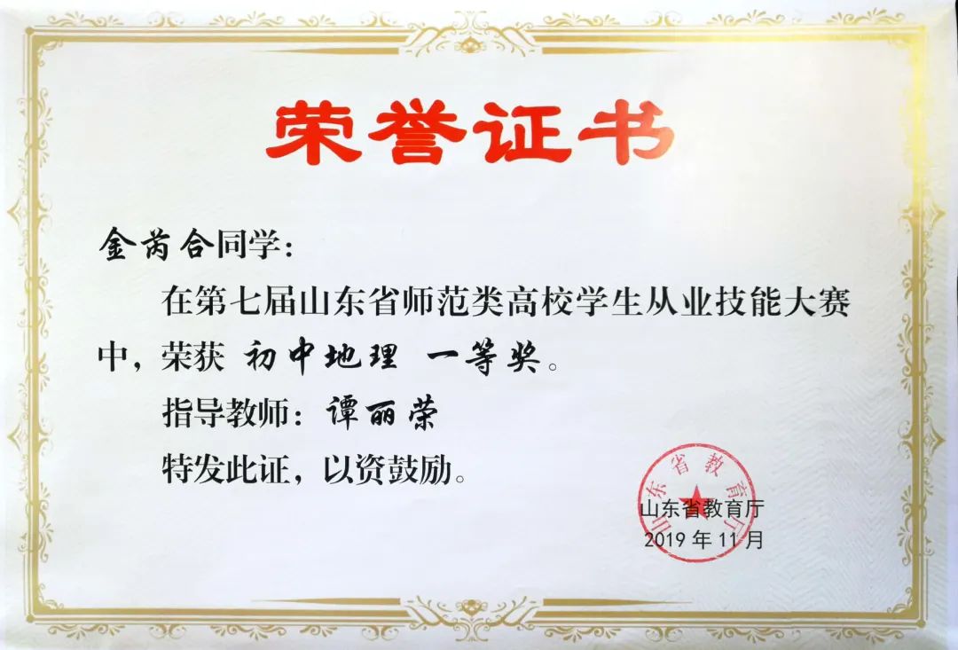教学技能大赛一等奖”,2019年11月获得“第七届山东省师范类高校学生从业技能大赛一等奖”。此外,她还积极投身社会实践,多次参加学校团委以及学院组织的各种社会实践活动,在志愿者服务、支教等活动中实现了她的自身价值。
