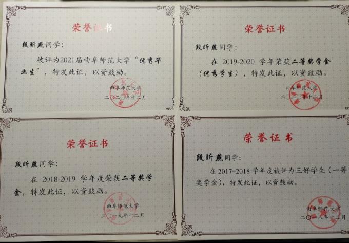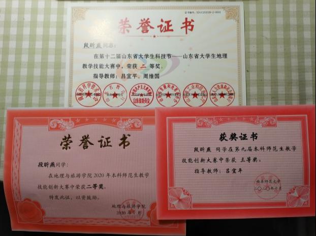 校优毕业生;山东省大学生地理教学技能大赛省二等奖;2019年全国啦啦操冠军赛公开青年丙组小集体组花球自选动作第二名;日照市第六届运动会“新世界杯”啦啦操比赛团体第一名;2017-2018年度校一等奖学金;2018-2019年度、2019-2020年度校二等奖学金。