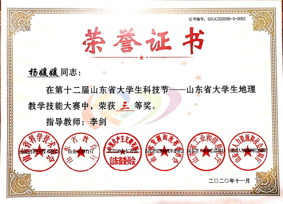 在专业技能方面,第八届山东省师范类高校学生从业技能大赛一等奖,十二届山东省大学生科技节地理教学大赛三等奖,老虎机
