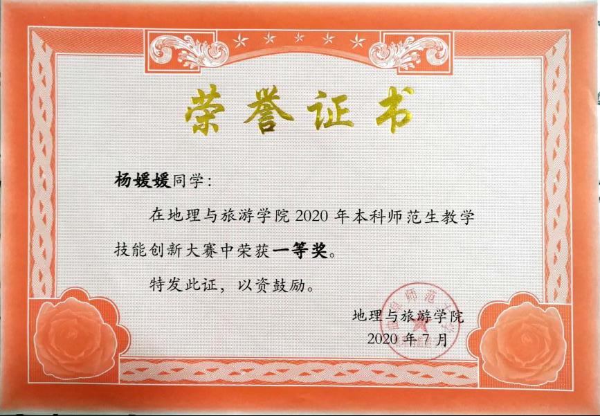 在学习方面,2019—2020年度成绩排名专业第一名,并在课余时间通过大学英语四六级、计算机二级、高中地理教师资格证、普通话等级考试等,多次获得奖学金,被评为优秀团员。