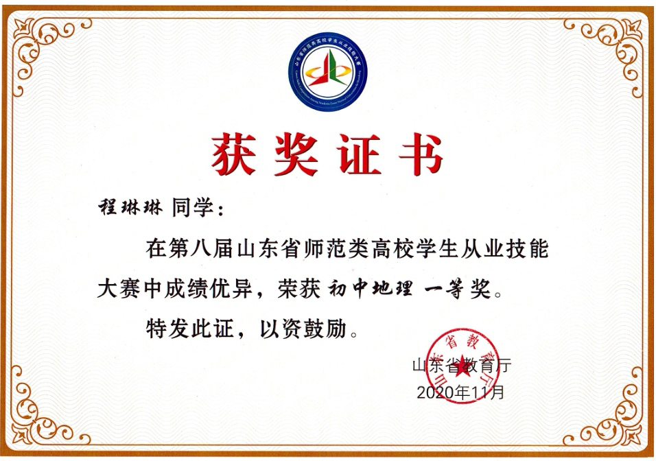 获奖情况:第八届山东省师范类高校学生从业技能大赛中初中地理一等奖
