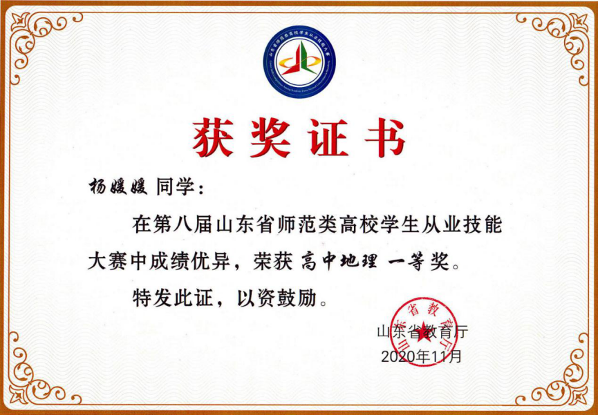 获奖情况第八届山东省师范类高校学生从业技能大赛高中地理组一等奖