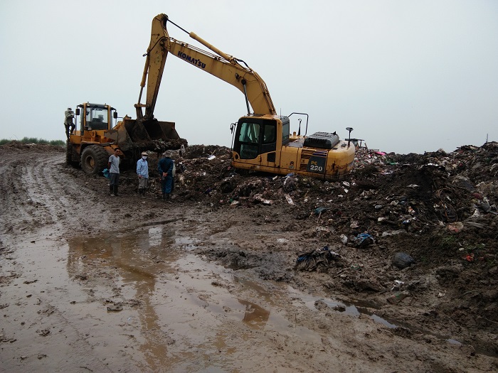 尽管当天雨后道路比较泥泞,他依然安排工作人员带我们参观了了各个处理步骤。首先,从县城以及各乡镇运来已经初步分类的固体垃圾与液体垃圾;然后固体垃圾会倒进已经铺好防护膜的填埋坑,在填埋坑填满时,表面会再铺设防护膜,并对产生的气体进行收集处理。液体垃圾会倒进液体垃圾收集池,经过过滤膜的初步过滤,将运往污水处理站进行进一步处理(超滤、纳滤、反渗透)。最后经过环保局的检测后,处理水会被排进河流。而固体垃圾填埋池上面则会种植绿色植被。
