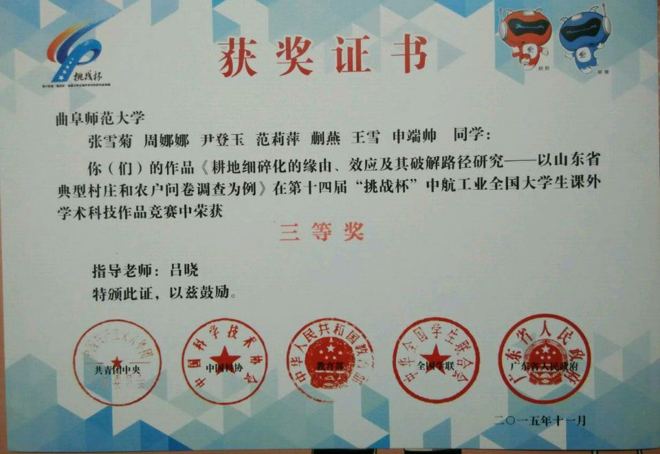 11月20日,第十四届“挑战杯”全国大学生课外学术科技作品竞赛决赛在广东工业大学落下帷幕,老虎机 选送的由吕晓老师指导、张雪菊、周娜娜、尹登玉、范莉萍、蒯燕、王雪、申端帅参与完成的经济类作品《耕地细碎化的缘由、效应及其破解路径研究——以山东省典型村庄和农户问卷调查为例》荣获三等奖。