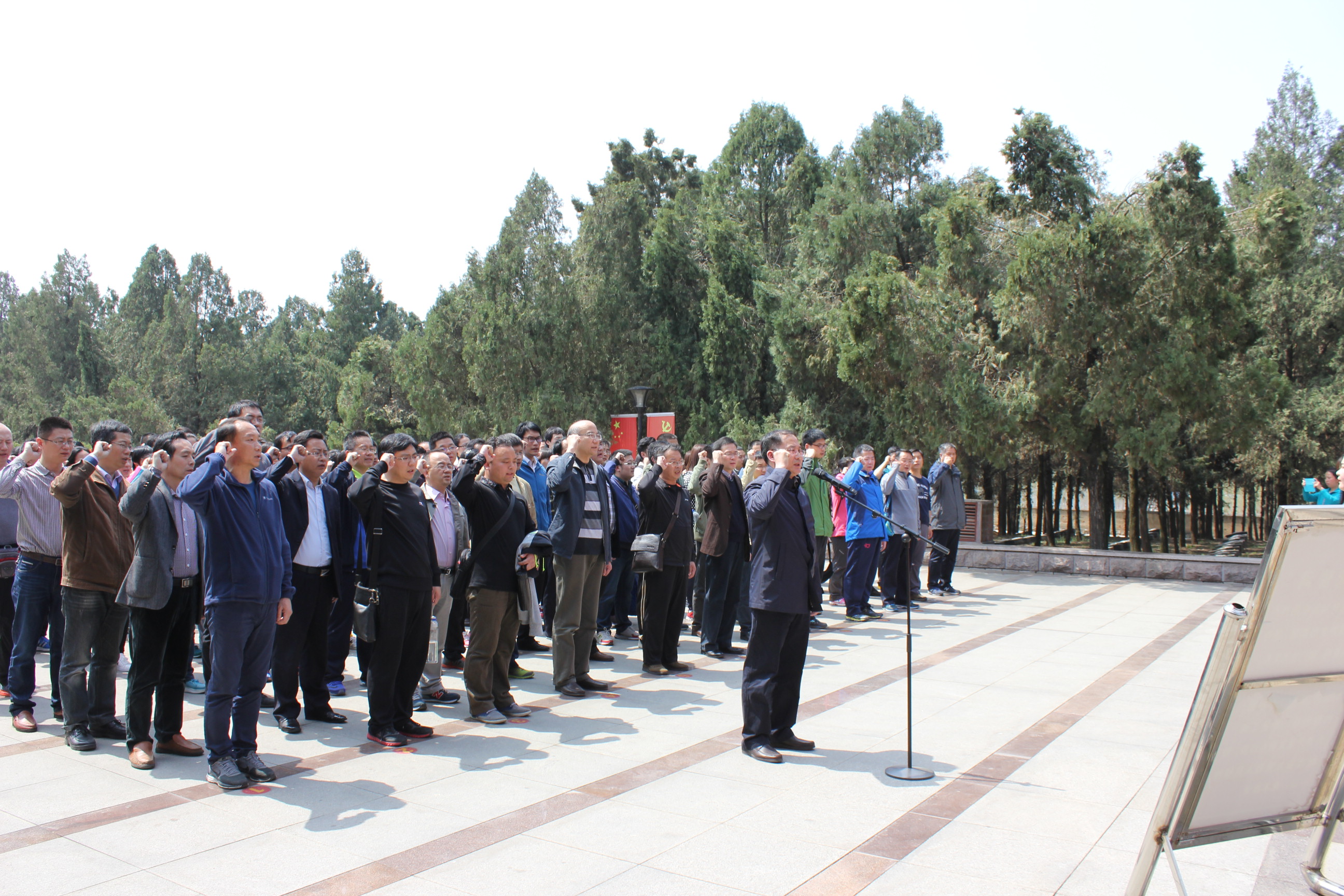 在烈士陵园区,墓地正中是粟裕将军骨灰撒放处,其后是烈士英名塔,塔身镌刻着在孟良崮战役中牺牲的2800多名烈士的姓名,墓区内掩埋着2800多名烈士的遗骨。全体党员向烈士塔敬献花圈,并在粟裕将军骨灰撒放处和烈士英名塔前举行了庄严的重温入党誓词仪式,全体党员举起右拳,面向鲜红的党旗和烈士墓碑庄严宣誓,“我志愿加入中国共产党。。。。。。为共产主义事业奋斗终身”的铮铮誓言久久回荡,一种神圣的使命感在每个党员心中升腾。