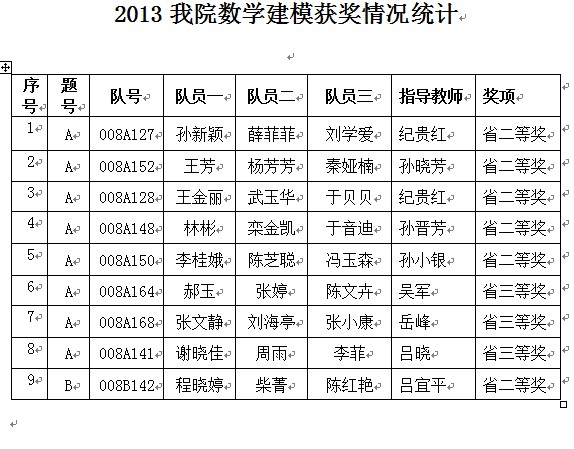 学生在2013年全国大学生数学建模竞赛中共有9个参赛队获奖,其中6个队省级二等奖,3个团队获省级三等奖。