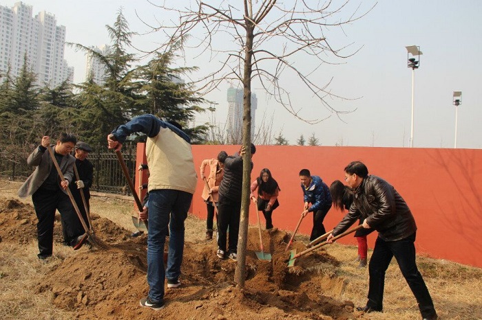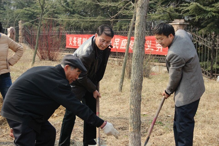 师生就栽种好了两棵白蜡树。在胡书记的邀请下,地理学院与管理院党总支书记王刚等领导共同栽种了一棵树。