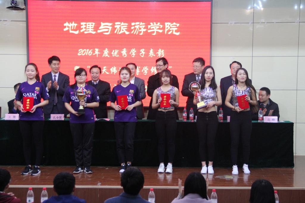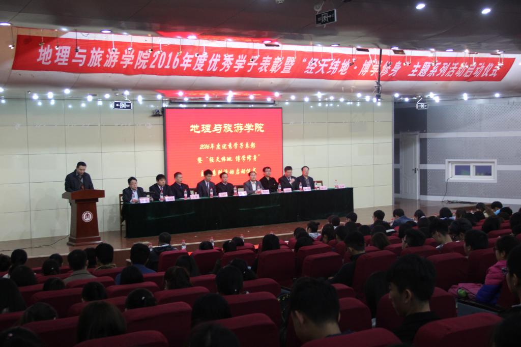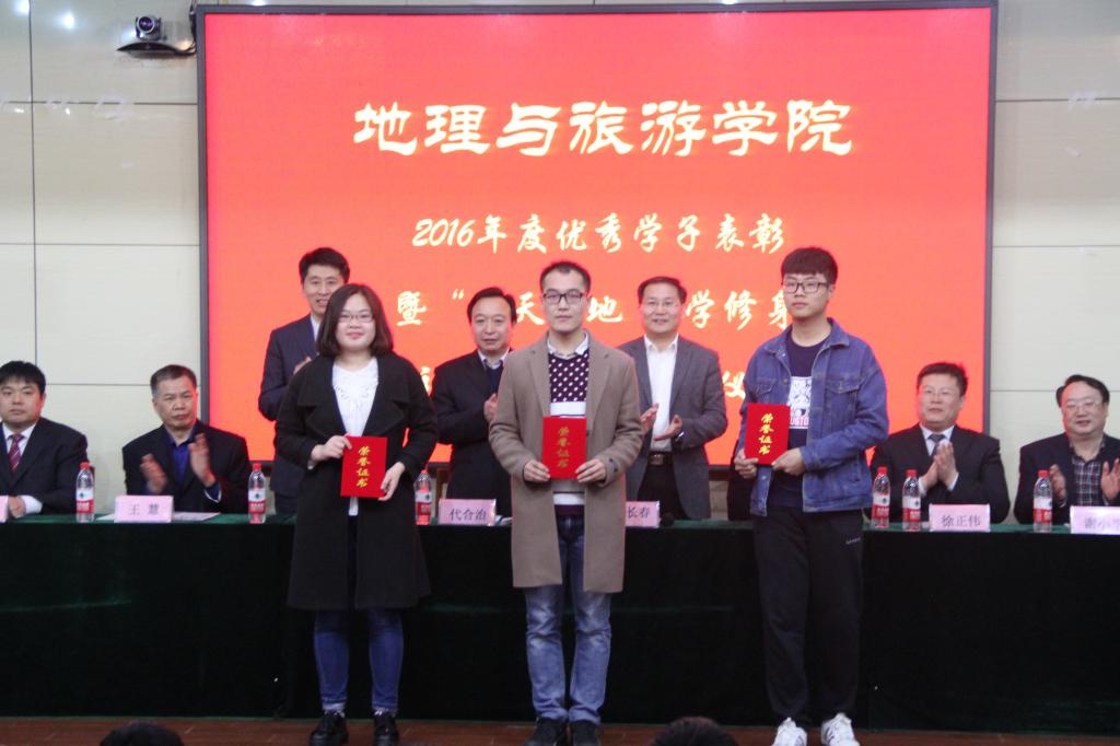 团委书记岳峰宣读2016年度优秀学子、科研创新、社会实践获奖名单并由出席活动的领导为其颁奖。优秀毕业生、全国地理教学技能大赛一等奖获得者范梦甜,十佳学子代表王凝恺作为学生优秀代表发言。优秀学子以自身经历为例,从“理想、勤奋、兴趣”三个方面来总结大学的学习生活和课外活动,讲述自己获得的学习竞赛荣誉、科研创新成果以及社会实践生活的努力过程和成长感悟,展现了地理学院学子励志博学、明德修身、拼搏向上、努力成才的风采。