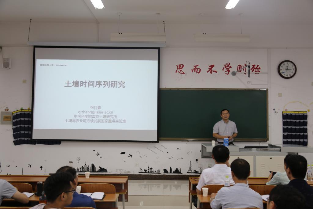 主办的“经纬讲堂”之高端论坛——“土壤时间序列研究”学术报告会于JS213成功举办。中国科学院土壤研究所研究员、中国科学院大学教授、博士生导师张甘霖先生担任主讲人。学院党委书记胡长春、院长张全景教授、副院长吴军、吕晓以及荆延德、李吉霞、贾维花、李俊莉、潘继花、王萍、单瑞峰、刘飞、秦霞、刘国栋、赵爽、郭付友等老师出席,2018级全体在校研究生、部分2017级研究生及2017级地理科学专业本科生等一百余人参加,张全景院长主持报告会。