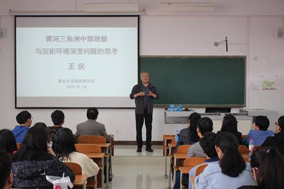 王庆教授以黄河三角洲中部地区形成历程为切入点,从不同方位简述黄河三角洲中部地区的地貌与沉积环境演变过程,引出对该问题的思考,并从不同时空尺度上对黄河三角洲中部的地貌与环境演变过程进行了实证研究和模拟研究结果分析,对黄河三角洲的部分区域如滦河三角洲以及莱州湾东岸的地质地貌特点向在座师生进行了详细的描述,进而结合河流演变历史引导大家推测其他区域的地质地貌演变情况。报告中,他结合不同的研究方法如沉积地貌学、海岸地貌学、气候地貌学和历史地貌学等,同时采用地貌学、沉积学、动力学和年代学相结合的技术路线,对中尺度海岸地貌与环境演变、气候变化、极端动力过程以及相对海面上升等情况对海岸地貌与环境的影响等问题一一发表见解,使老师和同学们对地貌与环境演变的相互关系有了新的认识和更高层次的了解。
