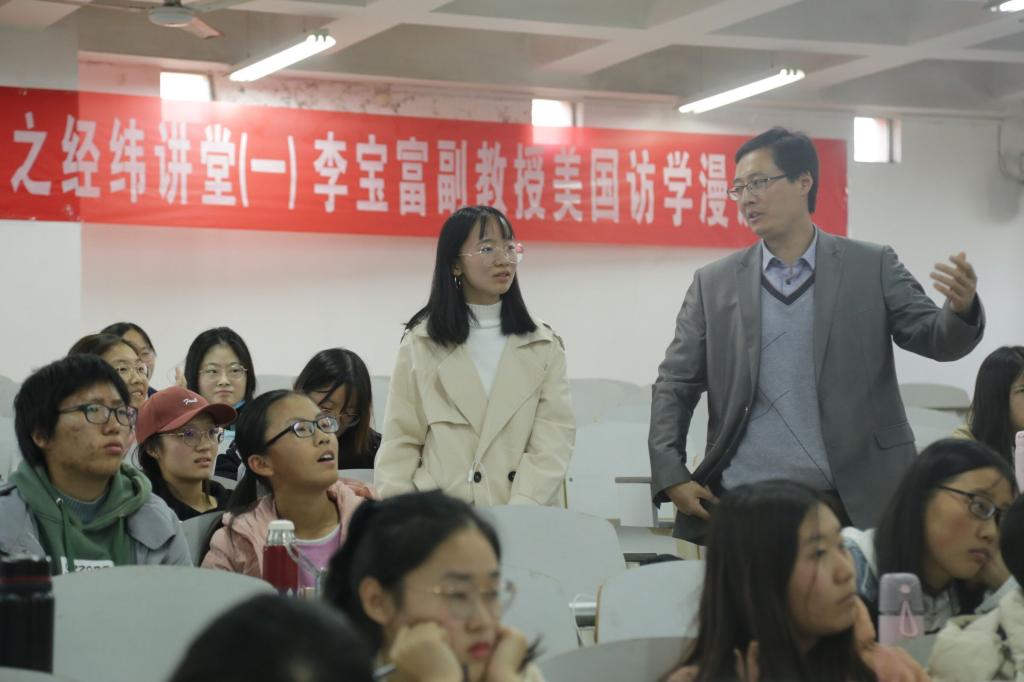 会议伊始,刘伟对李宝富副教授的到来表示热烈欢迎,并简述本次活动的目的意义,介绍了李宝富老师的基本情况。希望同学们用心聆听,认真学习。李宝富老师结合自己两年的美国访学经历,从美国访学、本科生考研问题、近期个人学术研究成果三个方面与同学们进行了分享交流。交流会中,李宝富谈到,随着全球化的发展和中国“一带一路”倡议的推进,中国越来越多地参与到全球治理中,这就要求同学们在掌握专业知识和技能的同时,必须具备国际视野、跨文化沟通和协作能力。他通过精美的照片向大家展示其在美国达特茅斯学院的访学研究和校园生活,展示了不同的人文风情,重点讲述自己对学术的新认识,即研究者在“专、精”的同时也要兼顾“广、博”。最后,李宝富表示,希望自己的讲解能给同学们带来更深远的思想碰撞和智慧启迪。通过讲解,同学们对相关问题产生浓厚的兴趣,李老师结合近期的学术研究与同学们展开学术研讨,同学们积极与老师进行互动讨论。