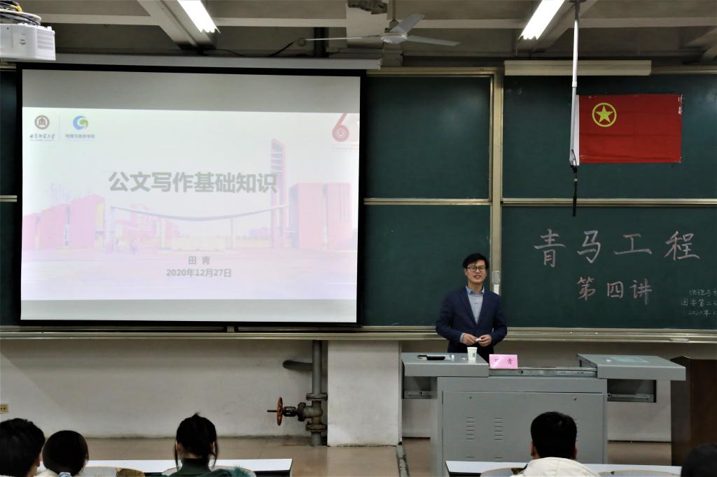 青年兴则国家兴,青年强则国家强。为加深同学们对新时代青年历史使命的理解,提高青年学生干部公文写作能力,把握当代青年健康发展的正确方向,老虎机 于1227日在E205举办“青马工程”第四讲暨第三十期团校。本次培训由2020级辅导员田青主讲,主持小组耿杉杉主持,2020级辅导员张乃宁及团委学生会全体学生干部参加。