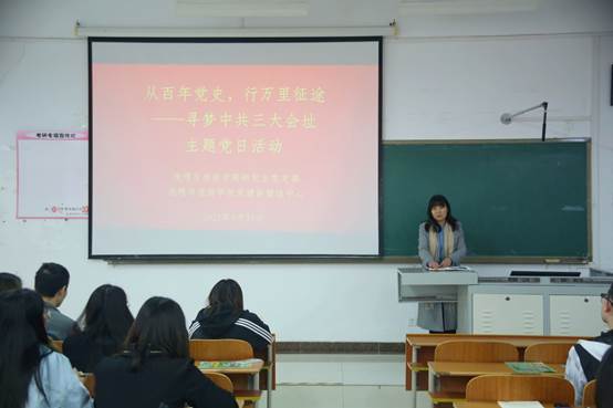 研究生党支部联合党建新媒体中心于2021年4月21日在S楼305教室举办“从百年党史,行万里征途——寻梦中共三大会址”主题党日活动。活动由研究生党支部组织委员马振秀主持,研究生辅导员赵岩及研究生党支部、党建新媒体中心全体成员参加。