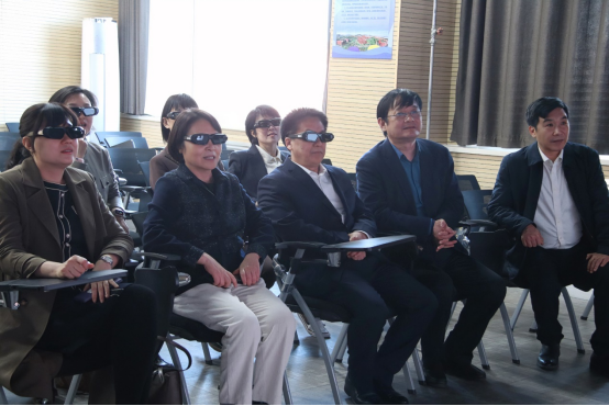 党委书记苏占兵汇报了山东省党建标杆学院创建成果。院长张全景汇报了实验室情况,窦爱民一行通过现场体验,了解学院利用虚拟仿真实验室进行多元化党建教育VR展示,全景式、沉浸式开展党史学习教育的情况。