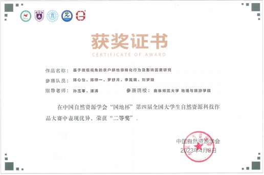 我院2020级土地资源管理专业陈心怡、陈梓一、罗舒月同学和2019级地理科学(师范)专业李翼展以及2021级土地资源管理专业刘梦璇同学组成的“阡陌晨光队”荣获全国二等奖,孙丕苓、潘涛老师获得优秀指导教师奖。获奖作品“基于微观视角的农户耕地非粮化行为及影响因素研究”以山东省7个地级市 16 个县(市、区)收集到的410份农户调查问卷作为基础数据,结合实地考察、参与式农村评估方法与Logistic回归分析方法,探究农户耕地非粮化行为决策及影响因素并提出相关建议,为政府制定相关政策防治耕地非粮化、保护粮食安全提供理论依据。