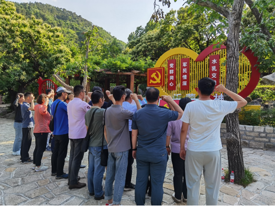 在沂蒙山小调诞生地,学院党委书记苏占兵带领大家面向党旗庄严宣誓。重温入党誓词,铿锵有力的誓言展现出全体党员不忘初心、牢记使命的信心和决心。随后大家走进沂蒙山小调纪念馆、大众日报社印刷厂纪念馆、抗大一分校文工团驻地旧址,以及沂蒙历史、沂蒙文化展馆,大家认真观看历史展板,详细听取沂蒙山人战斗历史和革命先辈英勇事迹,一段段详细的介绍让大家更深切体会到了沂蒙精神内涵。