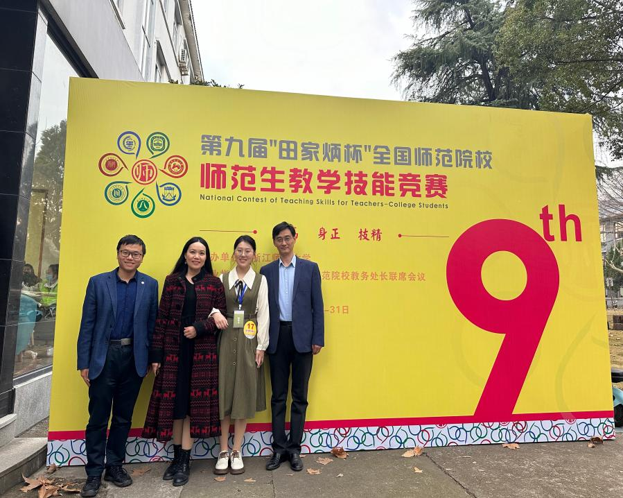 第九届全国师范院校师范生教学技能竞赛获得了“田家炳”基金会的冠名赞助,并由全国地方高等师范院校教务处长联席会议专业指导,浙江师范大学承办,是目前国内层次最高、规模最大的师范生学科技能竞赛,是纳入本科状态数据库填报的国家级竞赛项目。本届大赛经各高校校内选拔,来自哈尔滨师范大学、华东师范大学、重庆师范大学等学校,地理科学、思想政治教育、化学等11个专业的共计1212名选手参加了初赛。经初赛选拔,来自全国150所师范院校的优秀学子们齐聚金华芙蓉峰下,展示风采,切磋技艺。其中,我校共计有5位同学进入决赛,经过激烈角逐,叶繁同学最终以精湛的专业理论、精巧的授课技法、精心的教学设计成功获得一等奖的优异成绩,实现了同类赛事成绩新突破。