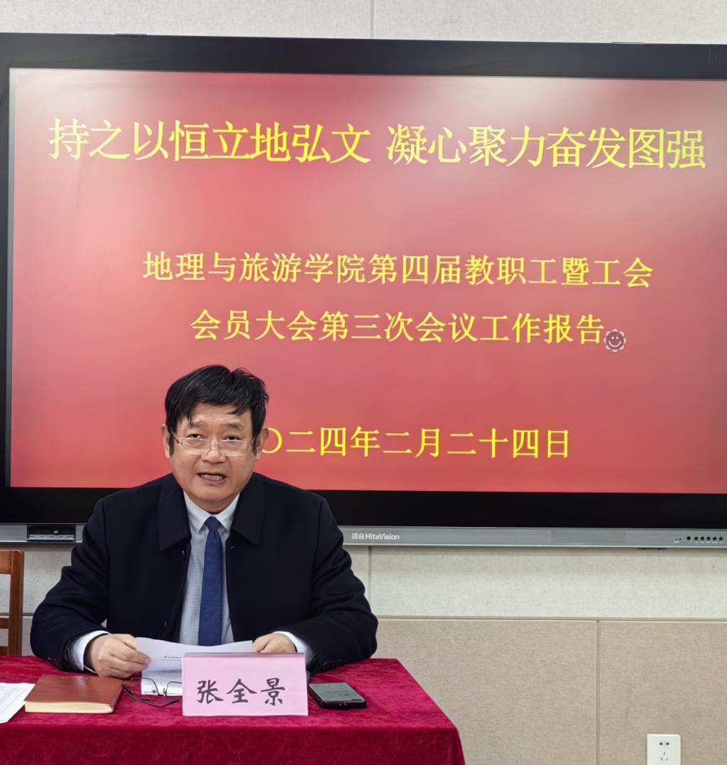 张全景在工作报告中指出,2023年全院师生认真学习贯彻习近平新时代中国特色社会主义思想,胸怀国之大者,潜心教书育人,顽强拼搏,勇毅前行,开新局、展新貌,创新绩、发新质,较好完成了各项任务,主要发展指标增幅在全校排名靠前,取得了可喜可贺成绩。一是党建引领培根铸魂。顺利通过“山东省党建标杆院系”验收,完成“一院一品”校园文化精品培育项目建设任务,获批学校全面从严治党示范学院、课程思政示范学院建设项目;二是专业建设成效显著。地理科学专业、旅游管理专业上榜中国大学专业排名,均获“B+”评级;1门课程获批国家一流本科课程, 1门课程获批省级课程思政示范课程,2门课程推荐参评国家一流本科课程。获得山东省教改重点项目1项、校级教改课题3项,获得省级本科高校黄河重大国家战略课程思政优秀案例2项;三是学科建设稳步推进。以地理学一级学科博士学位授权点申请基本条件为引领,持续强化学科特色,补短板、强弱项,做大做强自然地理学、人文地理学、地图与地理信息科学、自然资源调查与国土空间规划学等学科方向, 2位教授获得地理学博士生导师资格;四是平台建设亮点纷呈。获批山东省文化和旅游重点实验室(精品旅游业态创新与标准化建设重点实验室)、山东省普通高等学校实验教学示范中心(地理科学实验教学示范中心)、山东省普通高等学校示范性实习(实训)基地(国土利用与信息化产教融合示范性基地)、山东省普通高等学校示范性基层教学组织(老虎机