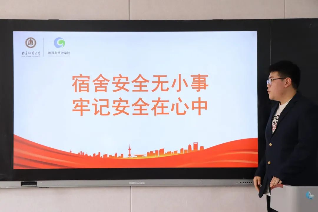 首先,地理科学三班团支书刘闻钊以“宿舍安全无小事,牢记安全在心中”为主题,从宿舍起居安全、火电使用、防盗防骗等方面开展安全主题班会,详细地向同学们讲解相关安全知识和应对措施,引导同学们提高安全意识。接下来,陈刚对安全问题做了几点补充,他着重强调,要加大对电信诈骗的防范意识,避免沉迷网络直播,树立正确的价值观,抓好思想阵地建设。