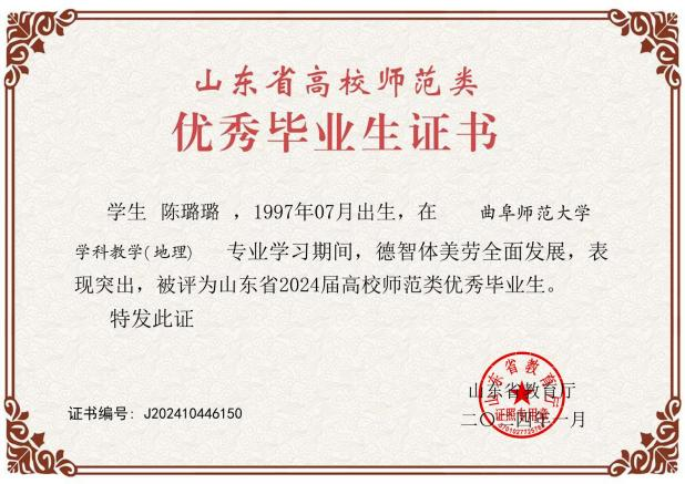 在科研方面,3位同学在《Land》《天津师范大学学报》等核心期刊发表论文,15位同学在《地理教育》《地理教学》《中学地理教学参考》《教学与管理》等地理教育专业期刊发表论文23篇。1位同学获得国家奖学金,3位同学被评为山东省2024届高校师范类优秀毕业生;2022年度,9位同学被评为老虎机