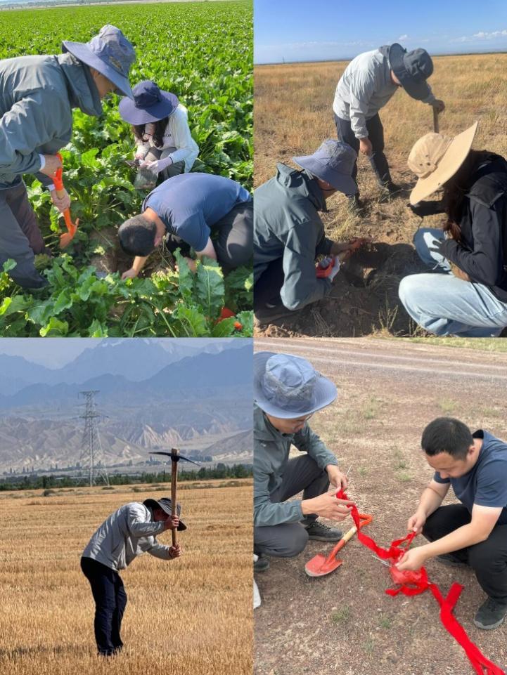 科考队结合卫星过境时间,在出发前详细制定了科考路径和工作计划,对沿线农田、稀草、裸土、稀灌等不同的地类进行了实地调研。科考队采用野外实地调查采样及摄影拍摄等手段,重点调查了乌鲁木齐-博乐-温泉-阿拉山口-托里-胡杨河-乌苏-独山子-乌鲁木齐沿线的地表覆被、土壤温度、土壤水分等地气关键要素,对调查区0-5cm、5-10cm、10-20cm三种不同深度的土壤进行了要素测量及取样,采集土壤样品近100份,将为陆气关键要素遥感动态反演模型的构建与验证提供数据支持。