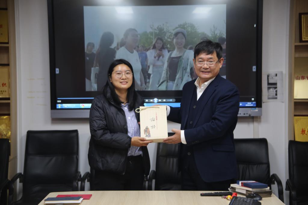 国内访学结业证书,院长张全景为其赠送曲园文创纪念品,表达了对其工作的肯定和对未来的美好祝愿。座谈会现场播放了公惟莹老师入校访学期间的工作微视频,共同回顾了一起工作学习的难忘瞬间。穿梭于曲园的教室与宿舍,定格在一场场会议研讨中专注的目光、烈日下军训场上的青春飞扬、深入学生宿舍园区看望学生的温馨瞬间……,一个学期访学历程如电影般回映,引得大家感动和难忘。
