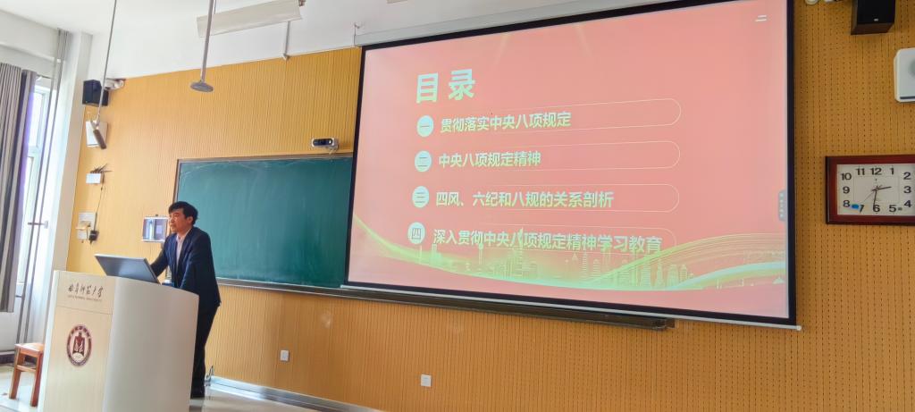 4月9日下午,学院在S楼314教室召开政治理论学习会议,全体教工参加学习。党委书记苏占兵以“切实将中央八项规定精神内化于心、外化于行”为主题,为全体教工讲授了一堂深刻而生动的党课。
