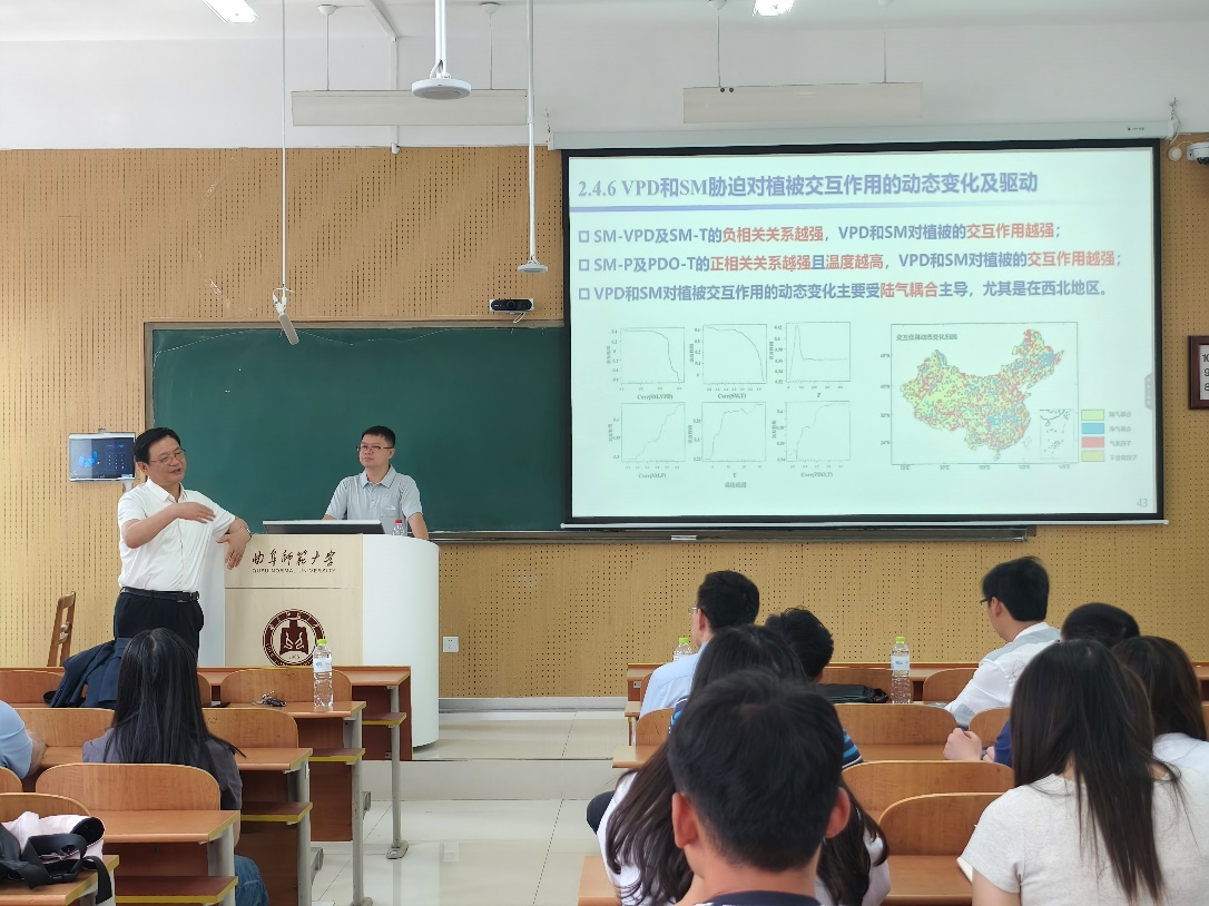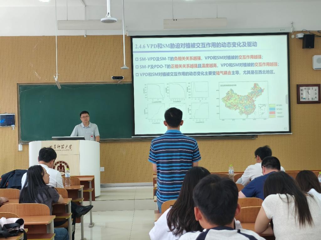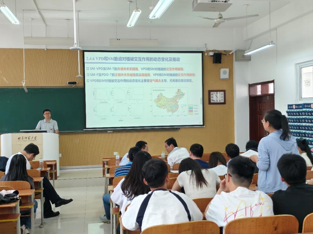 黄生志教授针对“干旱长链条传递特征与模式是什么?变化环境下如何演变?”“前期土壤湿度与变绿如何影响干旱的级联传递过程?”“农业干旱对气象干旱的反馈大小与负正反馈的转换阈值?”以及“气象与农业干旱的交互作用及其对植被的影响有多大?”等关键科学问题及其最新研究成果进行系统阐释。黄教授的报告紧密结合气候水文学领域学科前沿热点,精彩生动。在互动讨论环节,与会师生与黄教授展开深入交流,黄教授进行了深入浅出的细致解答。
