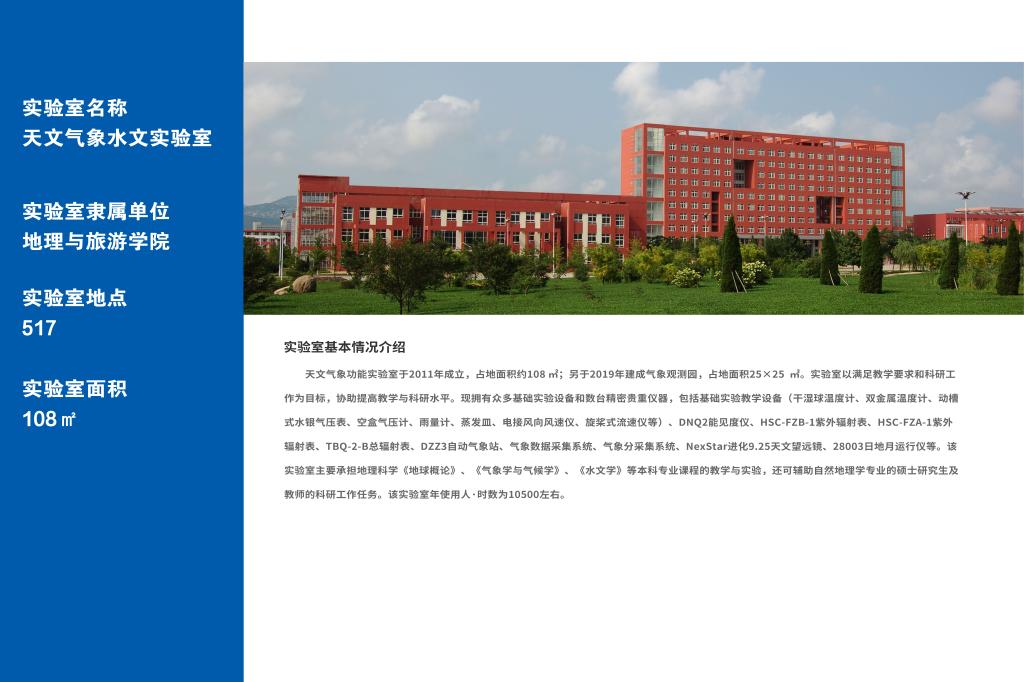 天文气象功能实验室于2011年成立,占地面积约108 m2;另于2019年建成气象观测园,占地面积25*25 m2。实验室以满足教学要求和科研工作为目标,协助提高教学与科研水平。现拥有众多基础实验设备和数台精密贵重仪器,包括基础实验教学设备(干湿球温度计、双金属温度计、动槽式水银气压表、空盒气压计、雨量计、蒸发皿、电接风向风速仪、旋桨式流速仪等)、DNQ2能见度仪、HSC-FZB-1紫外辐射表、HSC-FZA-1紫外辐射表、TBQ-2-B总辐射表、DZZ3自动气象站、气象数据采集系统、气象分采集系统、NexStar进化9.25天文望远镜、28003日地月运行仪等。该实验室主要承担地理科学《地球概论》、《气象学与气候学》、《水文学》等本科专业课程的教学与实验,还可辅助自然地理学专业的硕士研究生及教师的科研工作任务。该实验室年使用人∙时数为10500左右。